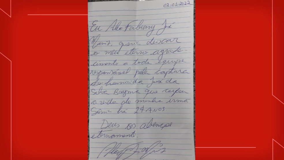 Após a prisão, o irmão da vítima chegou a escrever uma carta aos policiais que prenderam o suspeito do crime, em agradecimento.