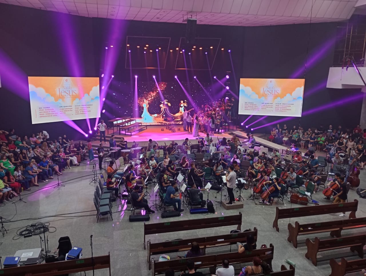 O espetáculo mistura encenações, cânticos sobre o nascimento de Jesus e orquestra. São 70 músicos, 140 coristas adultos, 80 crianças e adolescentes, 25 integrantes do coral de surdos, além da equipe técnica.