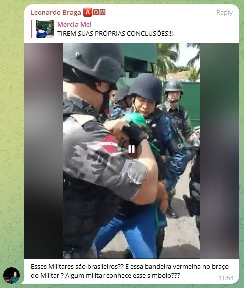 Um dos bolsonaristas questiona: "esses militares são brasileiros? E essa bandeira vermelha no braço do Militar? Algum militar conhece esse símbolo?".