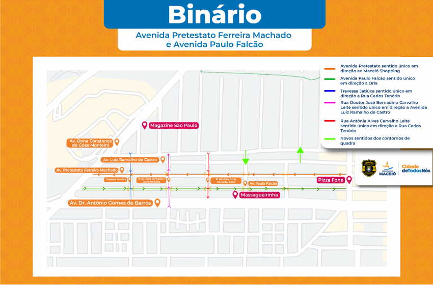 Mudança acontece por causa da implantação de um binário entre as avenidas Pretestato Ferreira Machado e Paulo Falcão Mapa mostra modificações em vias localizadas na Jatiúca, Maceió, após implantação de binário