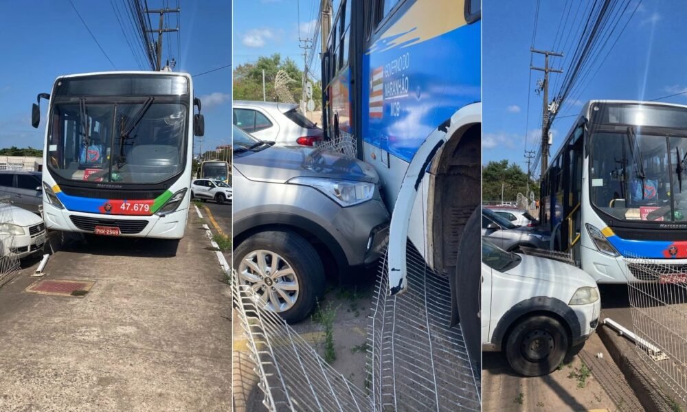 Um ônibus que integra o Sistema Metropolitano de Transporte da Grande Ilha colidiu, na manhã deste sábado (19), contra cinco carros que estavam estacionados na frente de um condomínio na Avenida Jeronônimo de Albuquerque, no bairro Angelim, em São Luís. Não houve feridos.