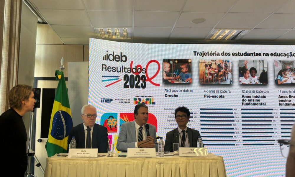 Índice considera o desempenho dos alunos principalmente em matemática e língua portuguesa, além de avaliar o fluxo escolar (número de aprovações e reprovações) de cada colégio, município e estado brasileiro. Metas estipuladas para 2021 não chegaram a ser renovadas neste ano. Manual Palacios, Camilo Santana e Carlos Moreno apresentam dados do Ideb 2023
