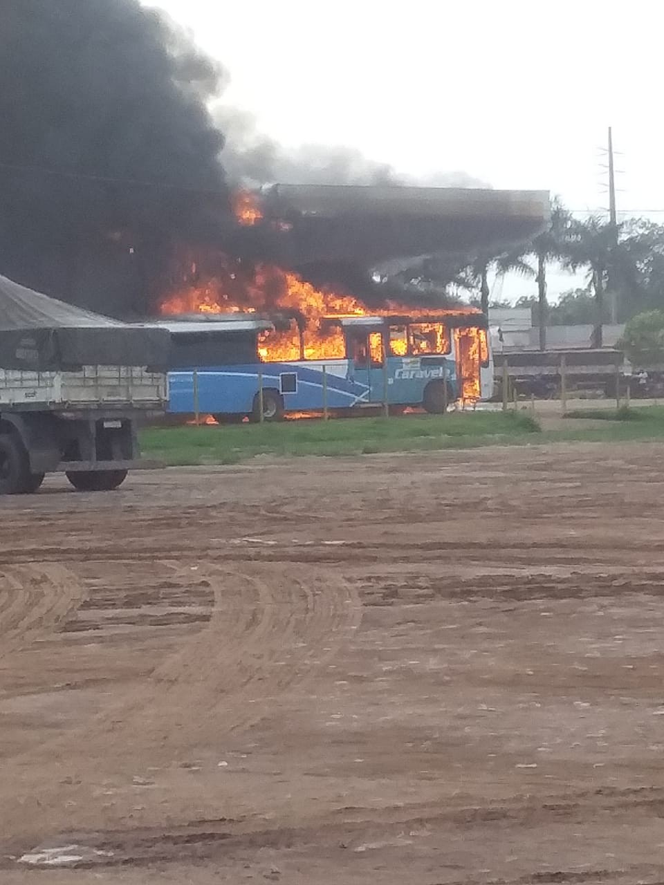 As chamas também atingiram um ônibus que estava estacionado no local. O posto fica localizado próximo à área conhecida como Trevo do Peteca.