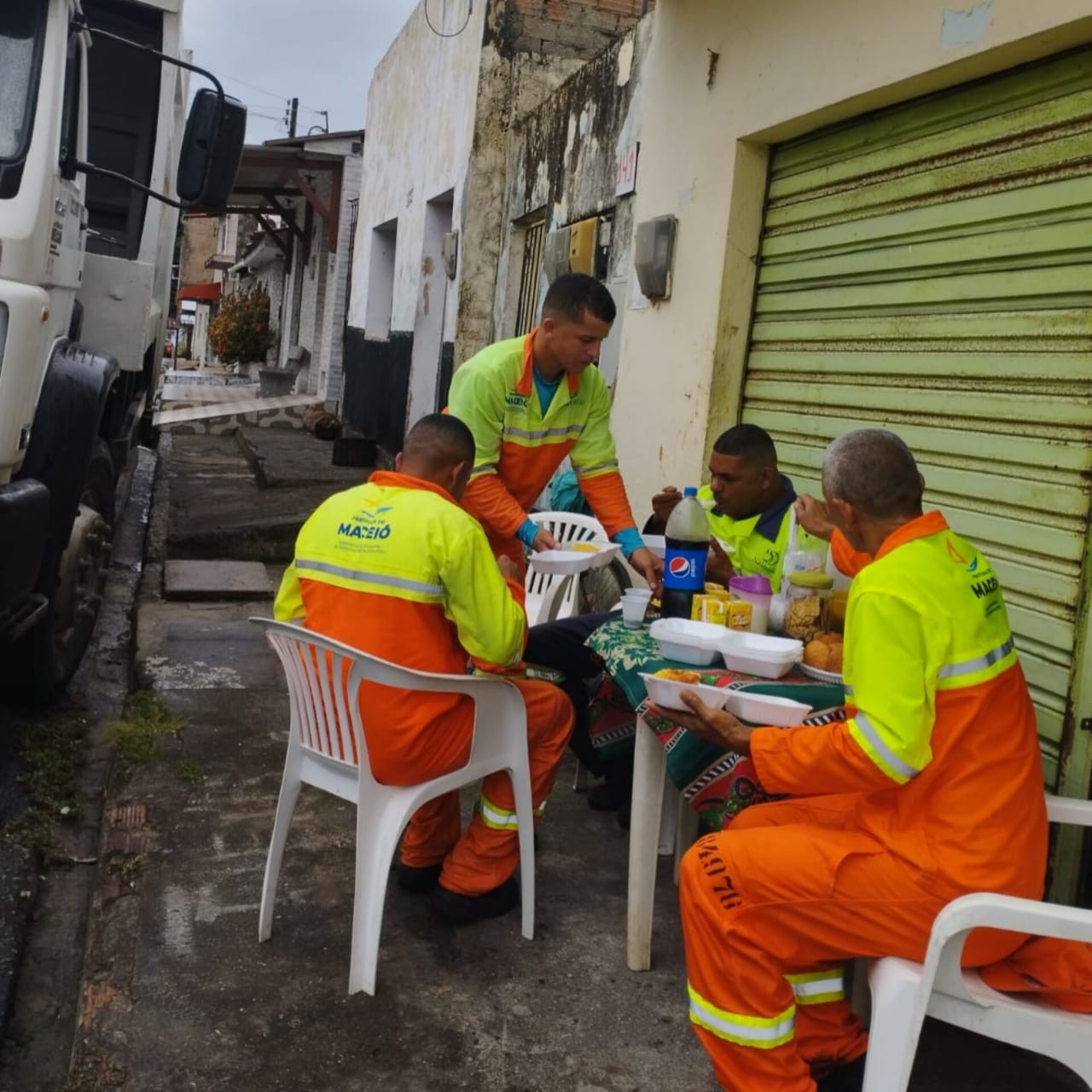 Mesa com bolo, café, bolachas e refrigerante foi preparada especialmente para os trabalhadores na véspera de Natal. Garis de Maceió ganharam café da manhã de Natal de moradores do bairro do Trapiche