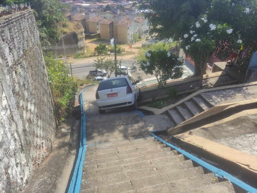 Homem disse que queria chegar na ladeira Geraldo Melo e por isso usou escadaria de forma imprudente. Carro ficou preso e precisa ser guinchado. Motorista desce escadaria em Maceió e carro fica preso