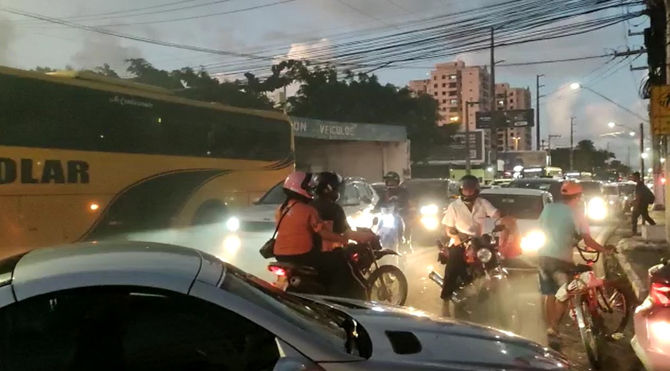 Trânsito congestionado na Av. Gustavo Paiva, em Cruz das Almas, Maceió, durante protesto contra falta d'água