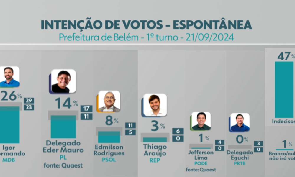 Com a margem de erro, Igor tem entre 39 e 45%. Já Delegado Eder Mauro (PL) tem entre 18 e 24% dos votos. Em agosto, Edmilson Rodrigues (PSOL) estava empatado com Igor no limite da margem de erro. Agora, em setembro, tem entre 8 e 14%, considerando a margem de erro.