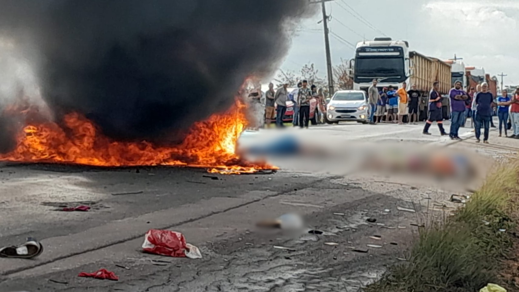 Com o impacto do acidente, veículo de passeio pegou fogo e a carreta tombou no acostamento da rodovia.