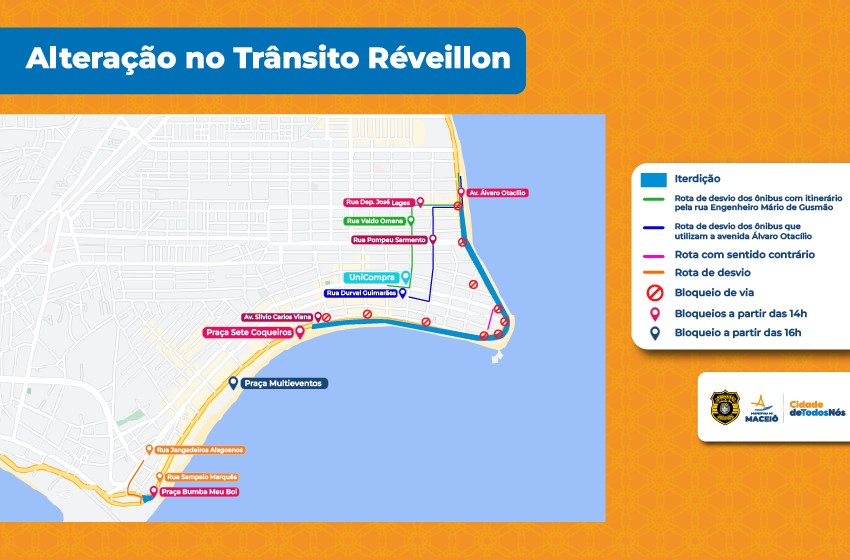 A Superintendência Municipal de Transportes e Trânsito (SMTT) elaborou um esquema especial de trânsito para garantir a segurança viária de pedestres e motoristas durante as comemorações do réveillon em Maceió, neste sábado (31). Haverá bloqueios e desvios de rotas.