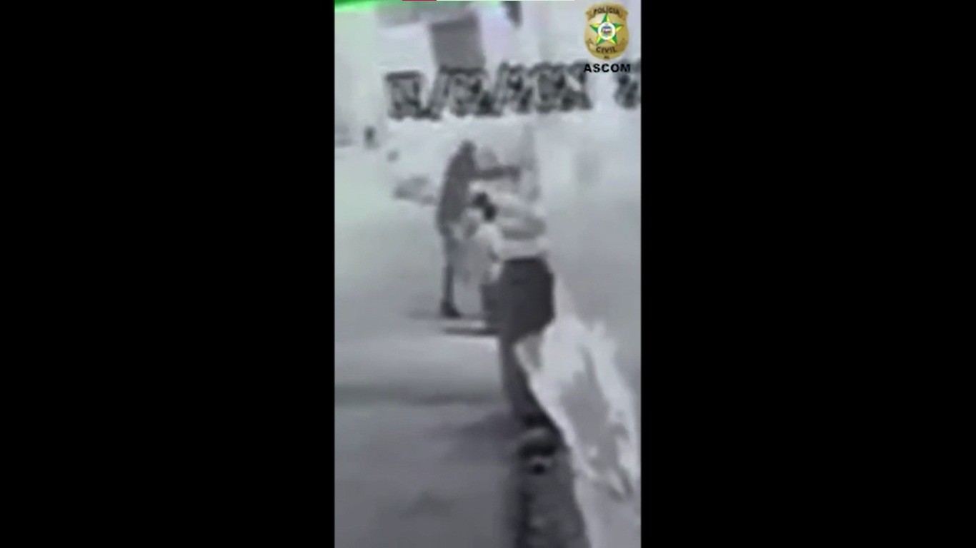 Dois criminosos chegam em uma moto. O passageiro desde do veículo em direção a uma casa. Uma câmera gravou o momento em que um homem faz vários disparos. A vítima não aparece nas imagens. Em seguida, foge do local.