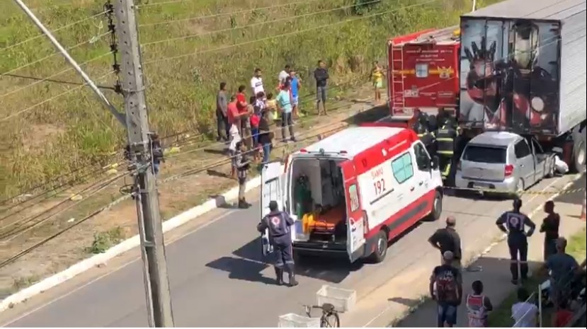 Em um vídeo, que registrou o momento do resgate, é possível ver que parte do carro ficou por baixo da traseira do caminhão. Ainda não há informações sobre o que causou o acidente.
