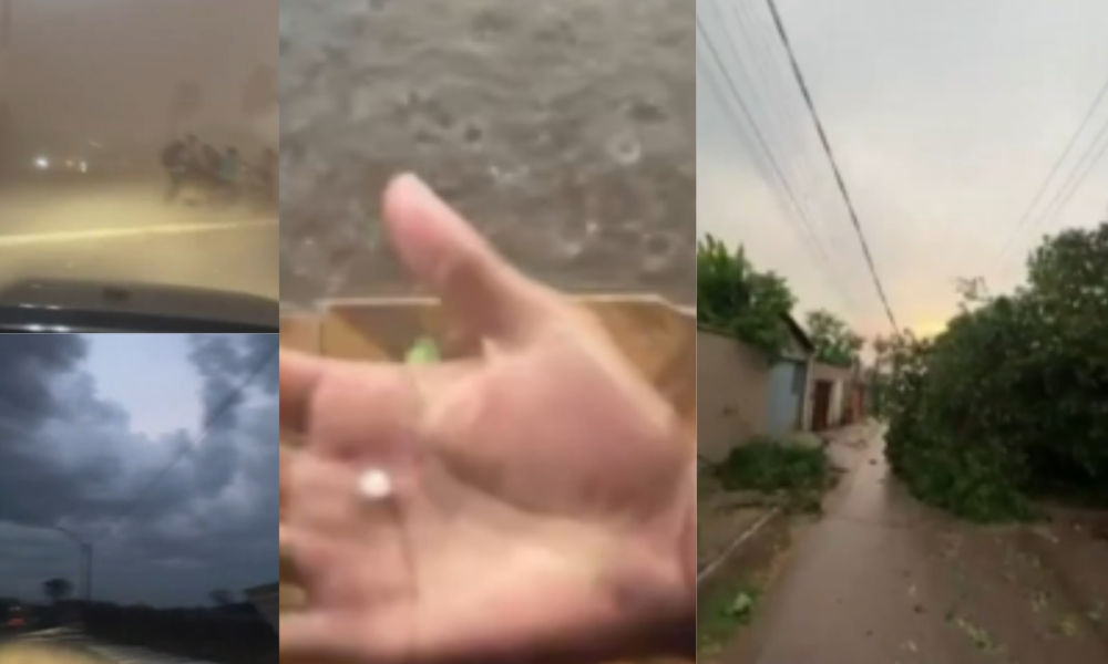 Em outro vídeo, um grupo de pessoas é gravado parado em meio à poeira espalhada pela ventania, os prejuízos foram muitos.